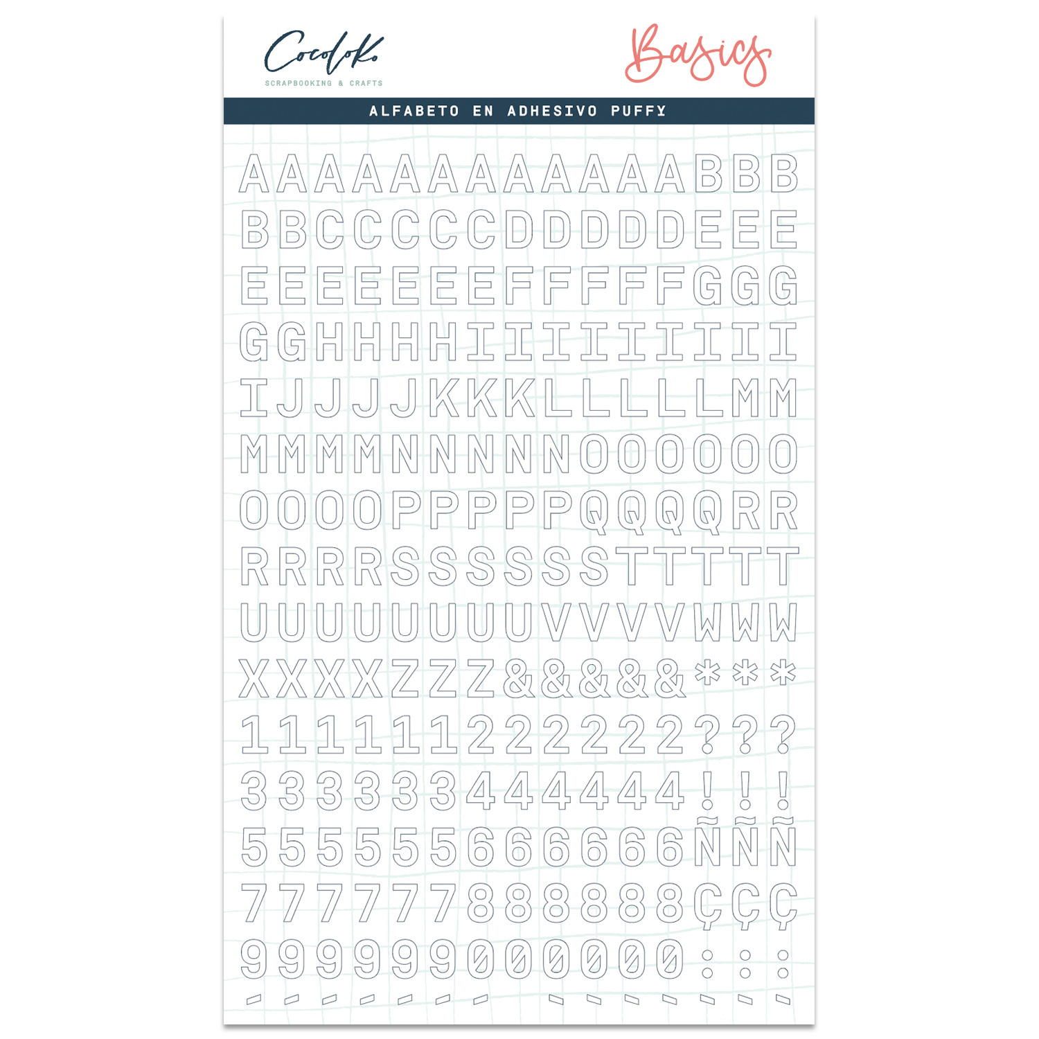 Alfabeto Puffy | Branco | Cocoloko 5,99 € Desconto de %. IVA incluído. Partilhar O produto encontra-se sem stock. Conjunto de autocolantes alfabeto puffy Cor branca Medida do conjunto 15 x 20 cm altura aprox. de cada letra 1 cm Nota: A cor dos produtos poderá sofrer alterações alheias à N/ responsabilidade, devido à diferente calibragem de cada ecrã. Marca Cocoloko Tags AlfabetoPuffyCocolokoPLProjectLifePasatiempos