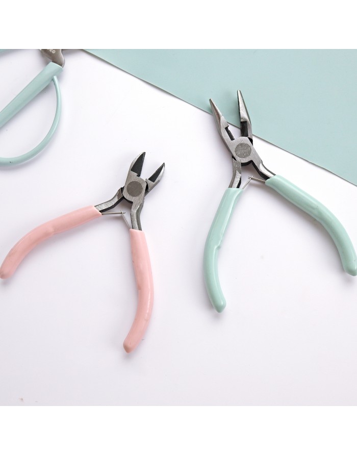 • Três alicates com punhos coloridos em azul e rosa segurados por uma mão