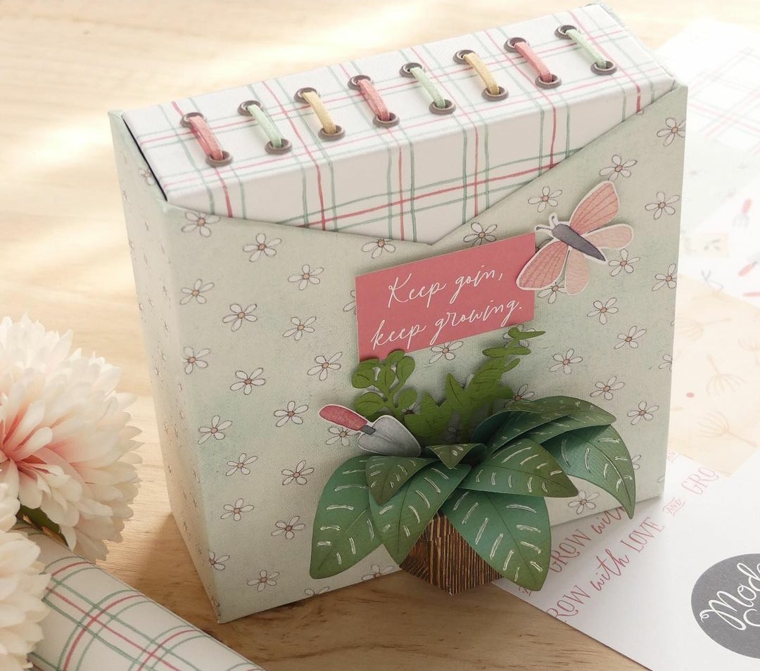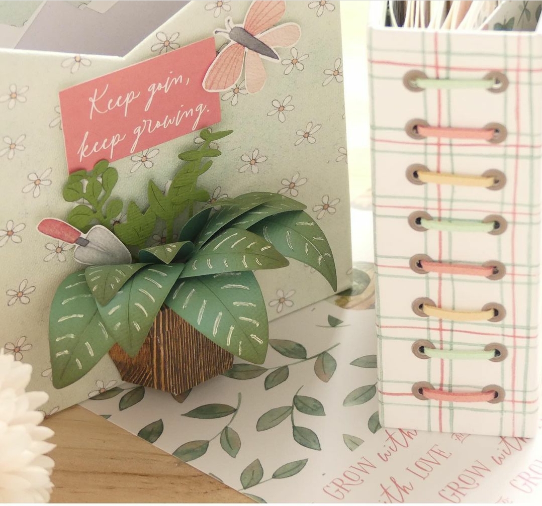 • Cartão decorativo com plantas em papel e caderno quadriculado com ilhóses coloridos