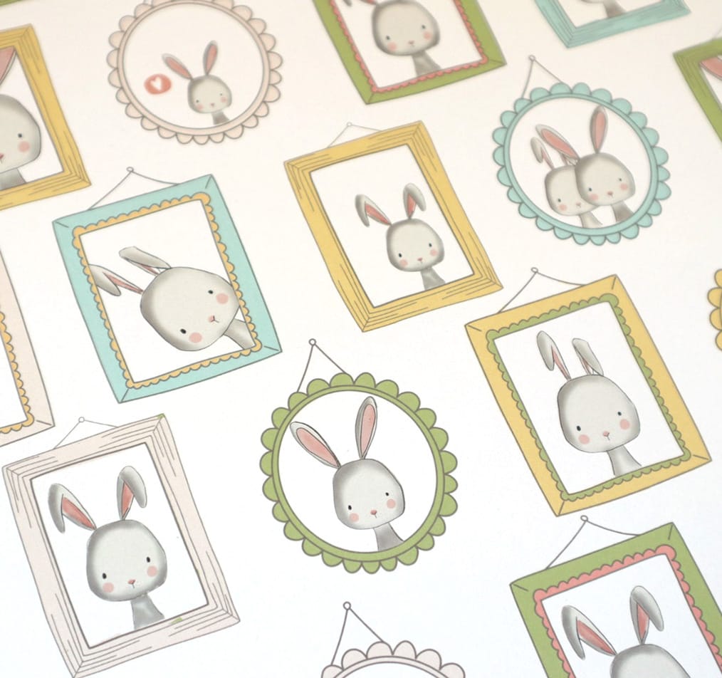 • Papel de parede com molduras coloridas contendo desenhos minimalistas de coelhos