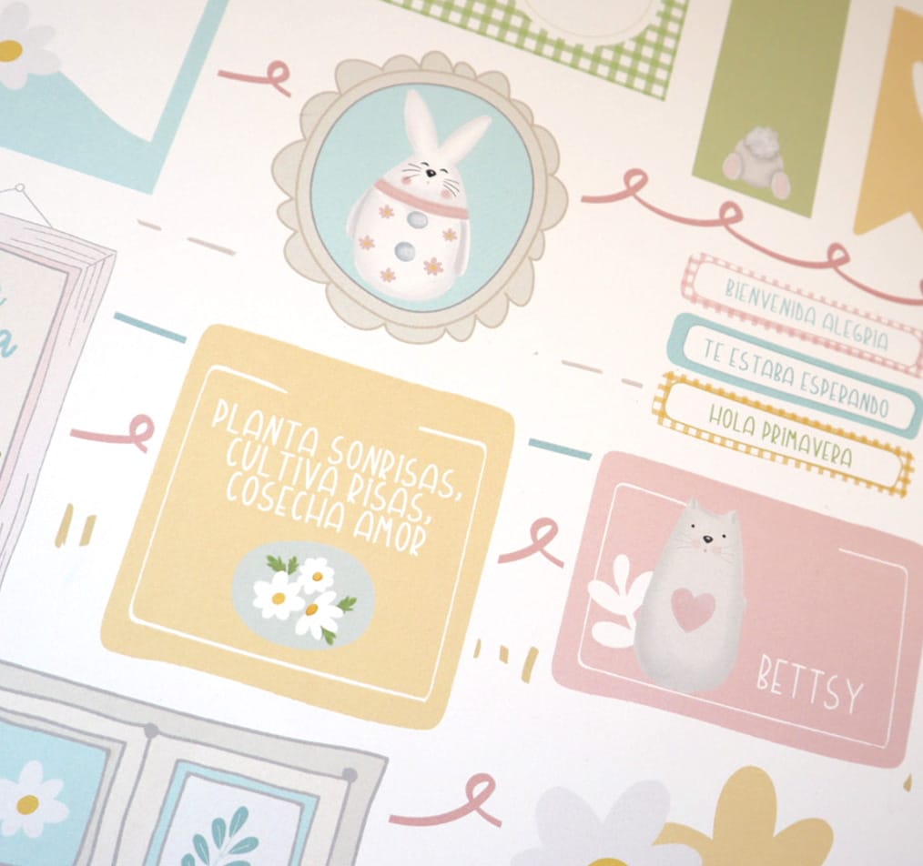 • Papel decorativo com ilustrações de coelho, animal cinzento e frases em português e espanhol