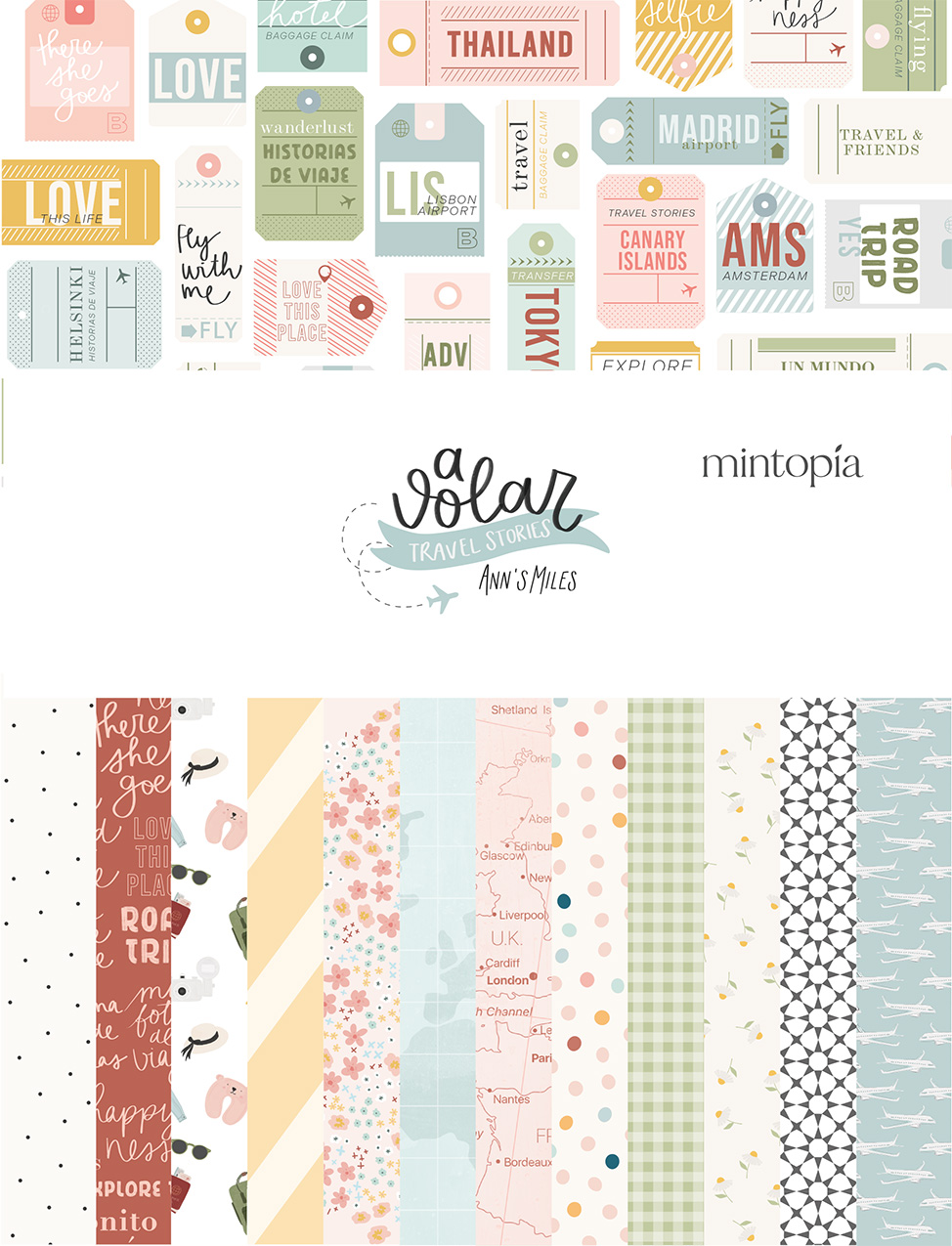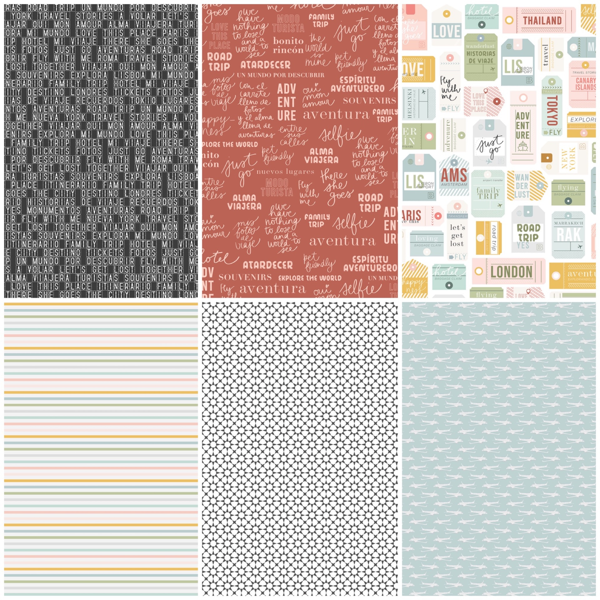 • Papel decorativo com padrões variados e texto relacionado a viagens