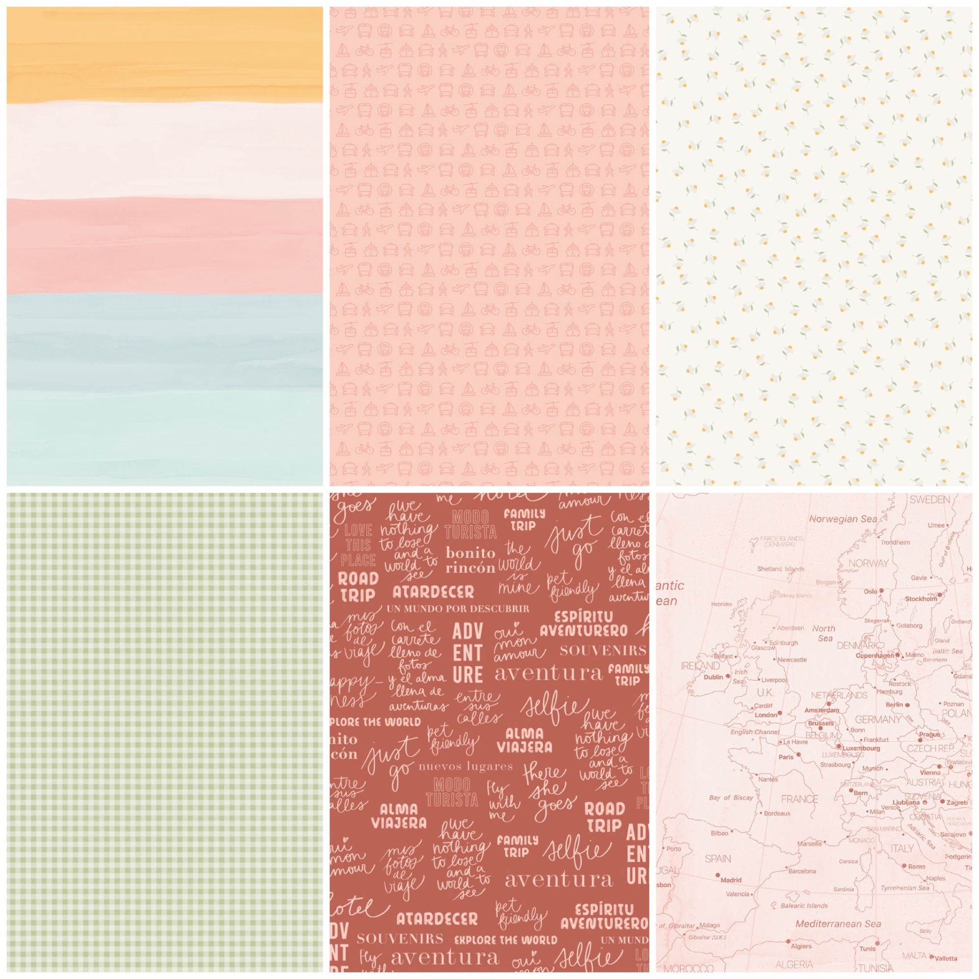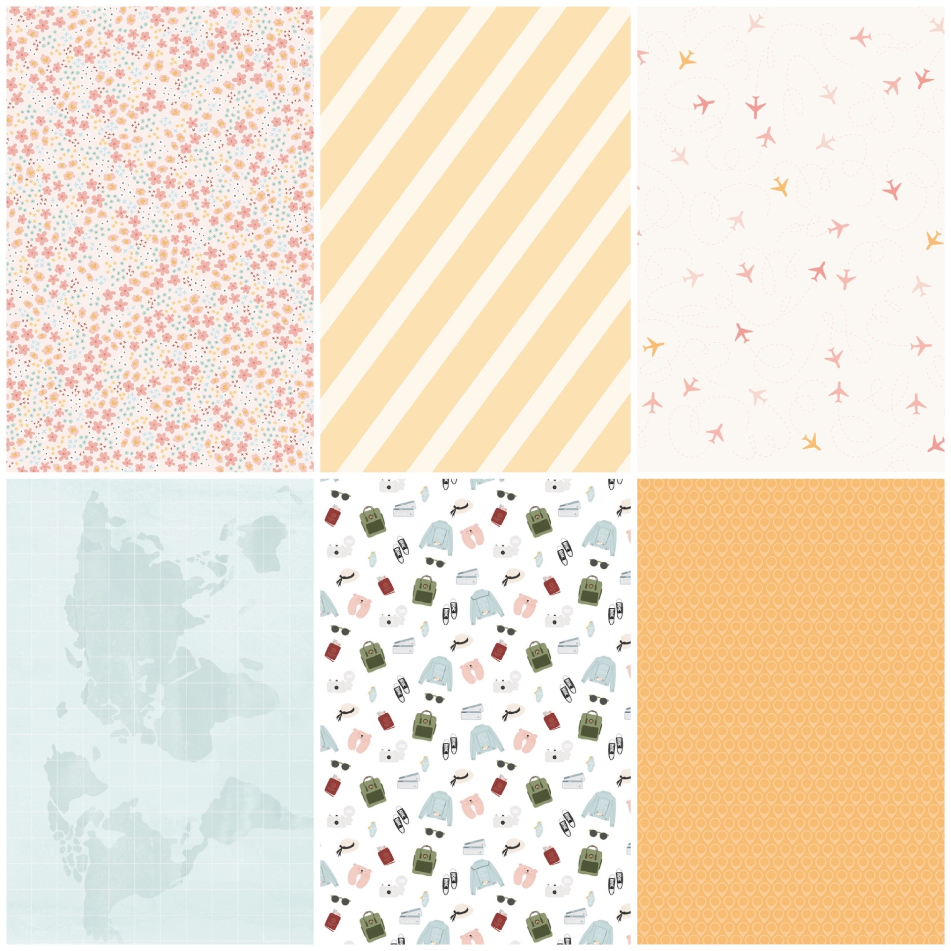 • Seis padrões decorativos em papel com motivos florais, riscas, estrelas do mar, mapa, objetos de viagem e padrão geométrico.