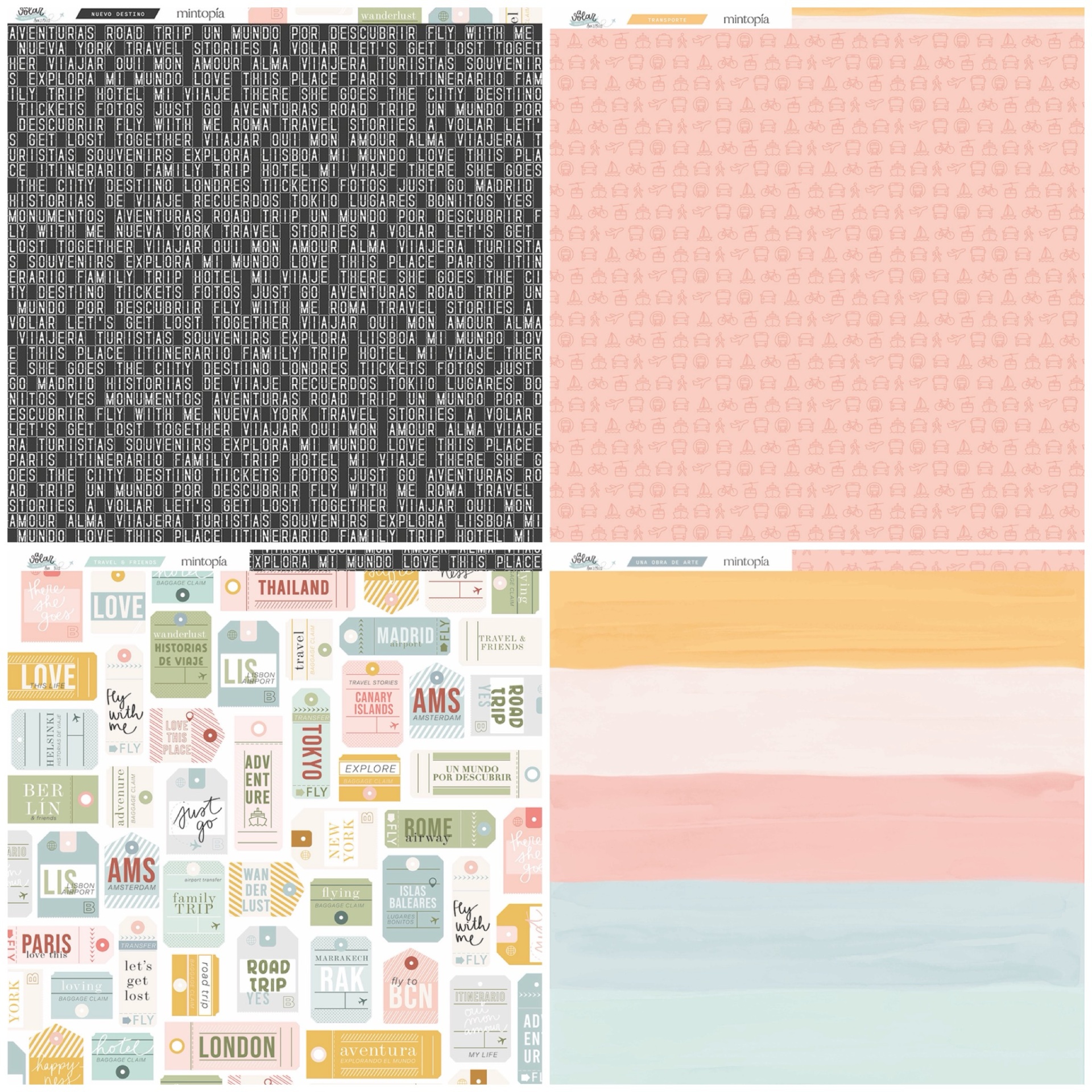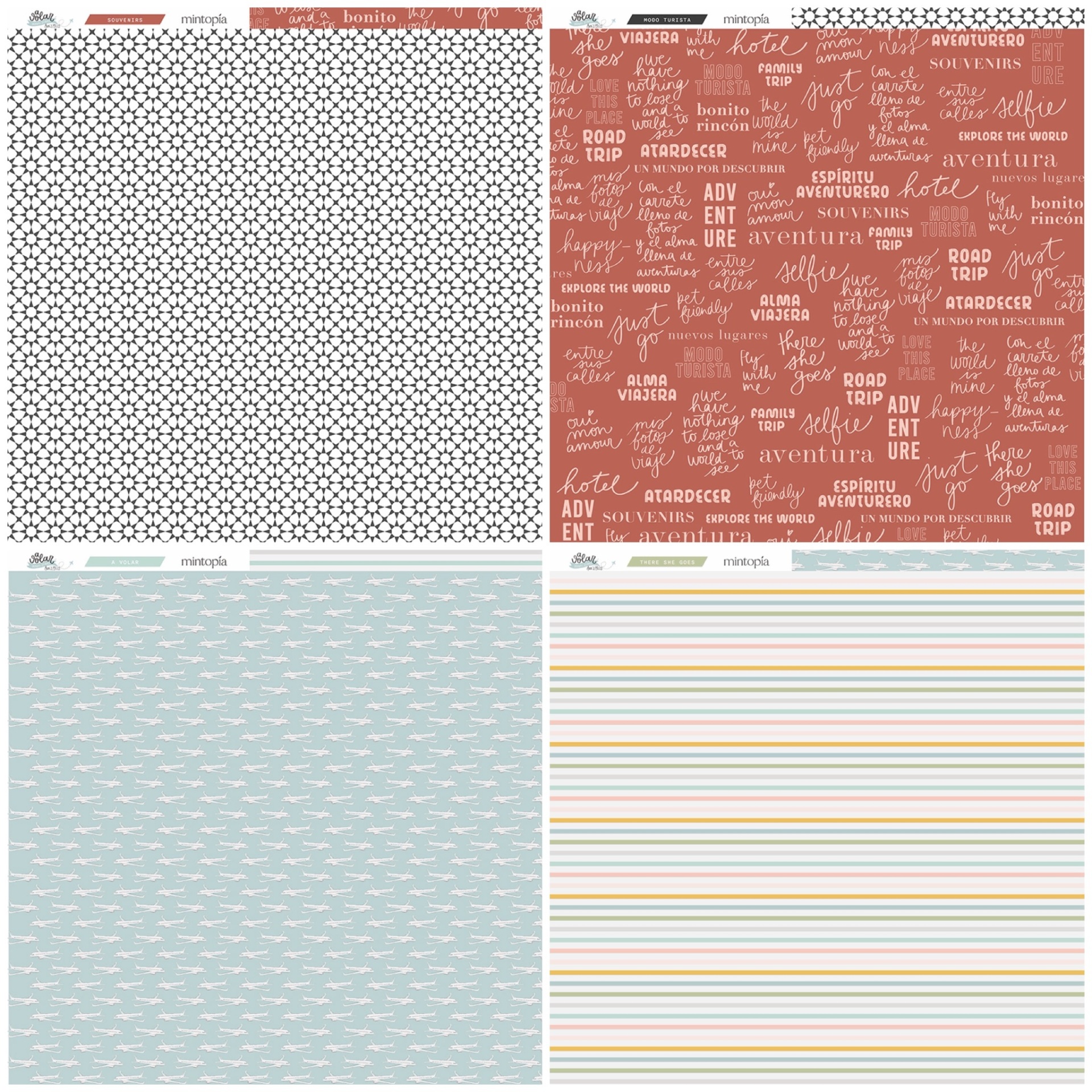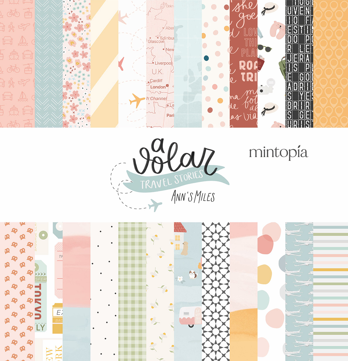 • Papéis decorativos coloridos com padrões diversos e texto a volar TRAVEL STORIES ANNSMILES mintopía