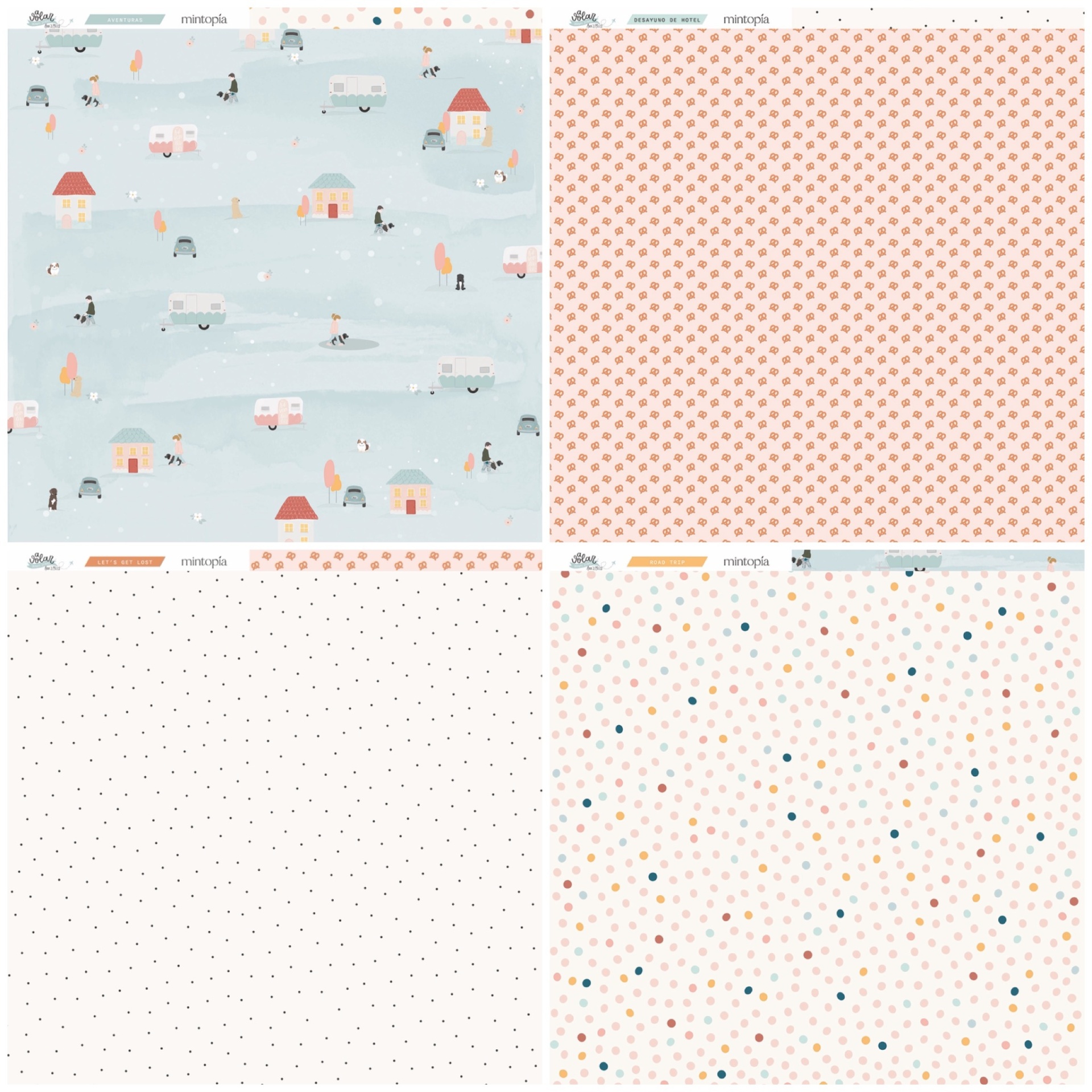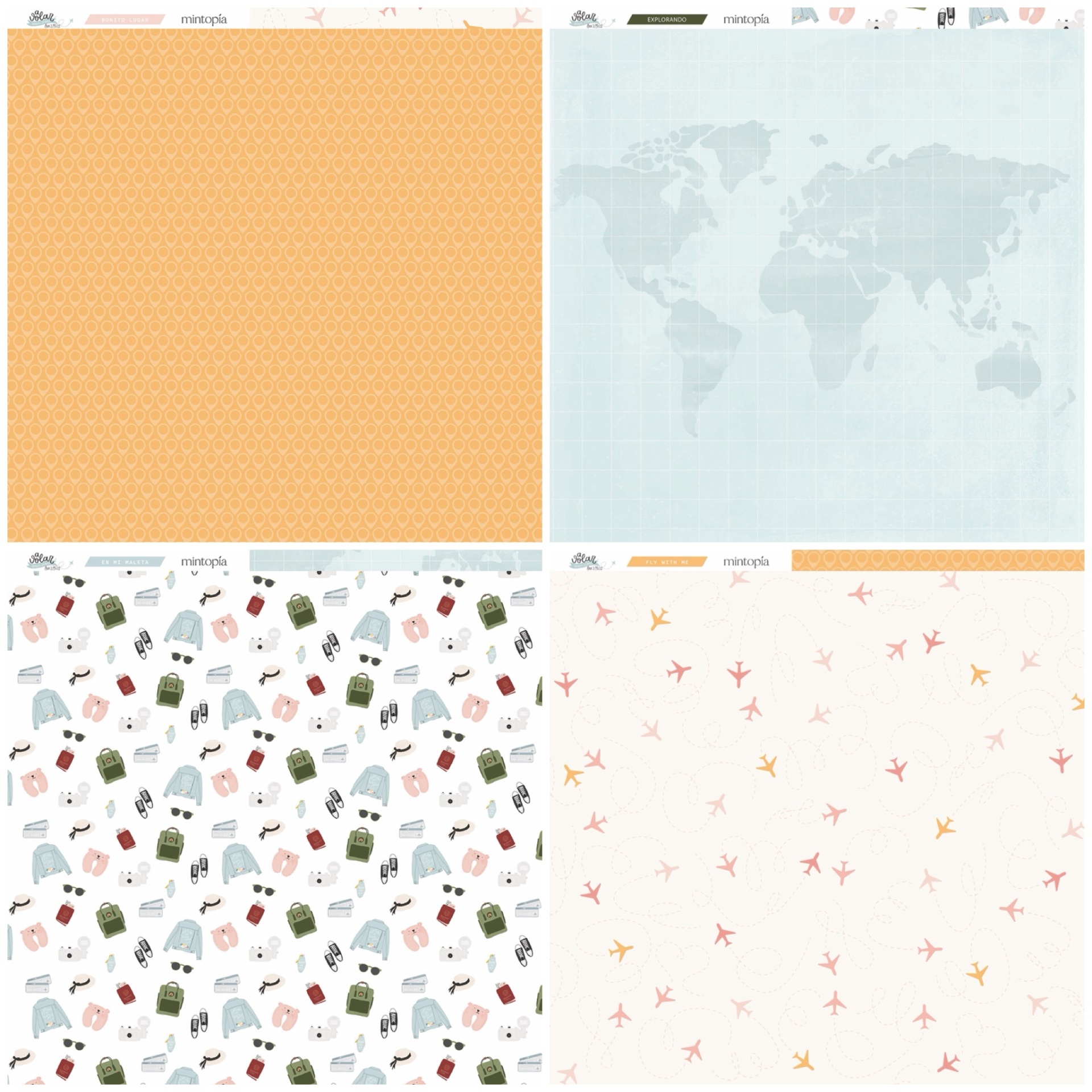 • Quatro padrões distintos de papel com motivos florais, quadrícula verde, mapa rosa e círculos coloridos