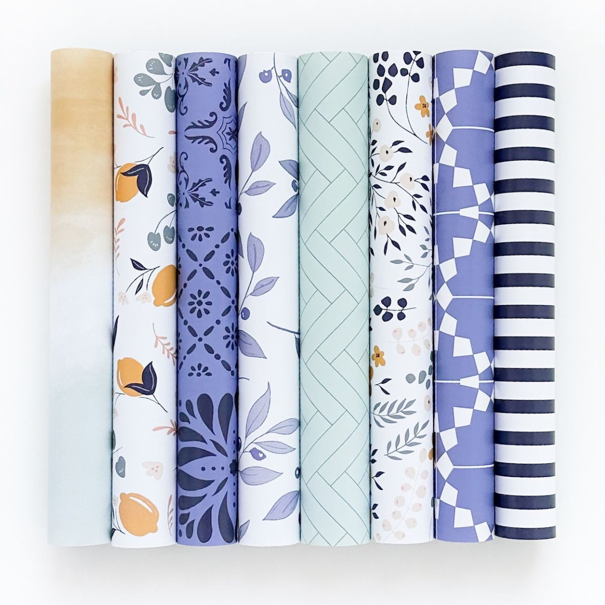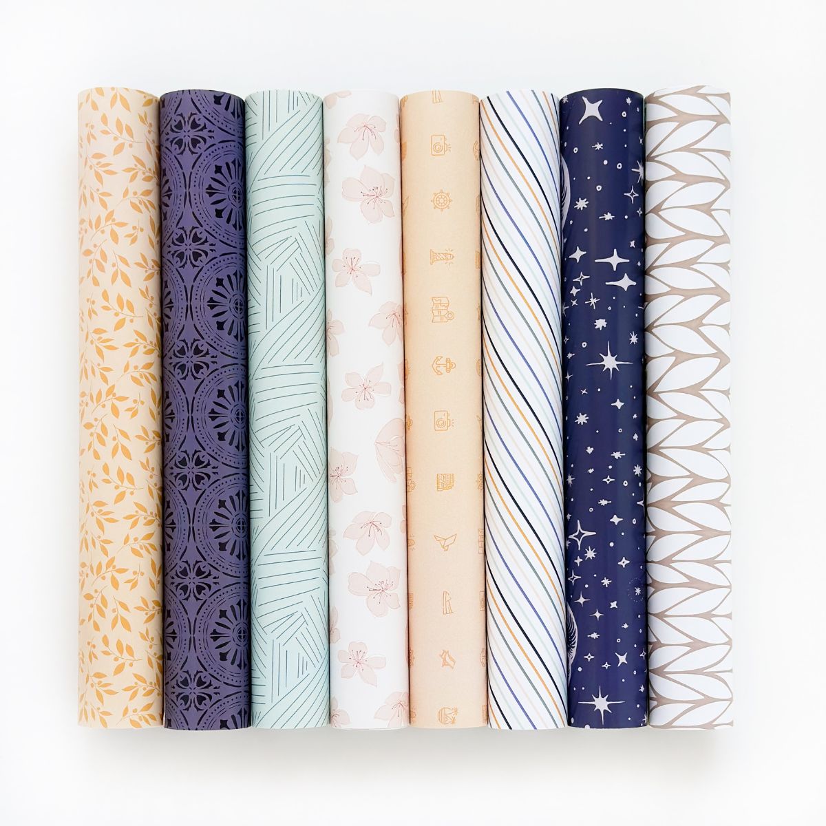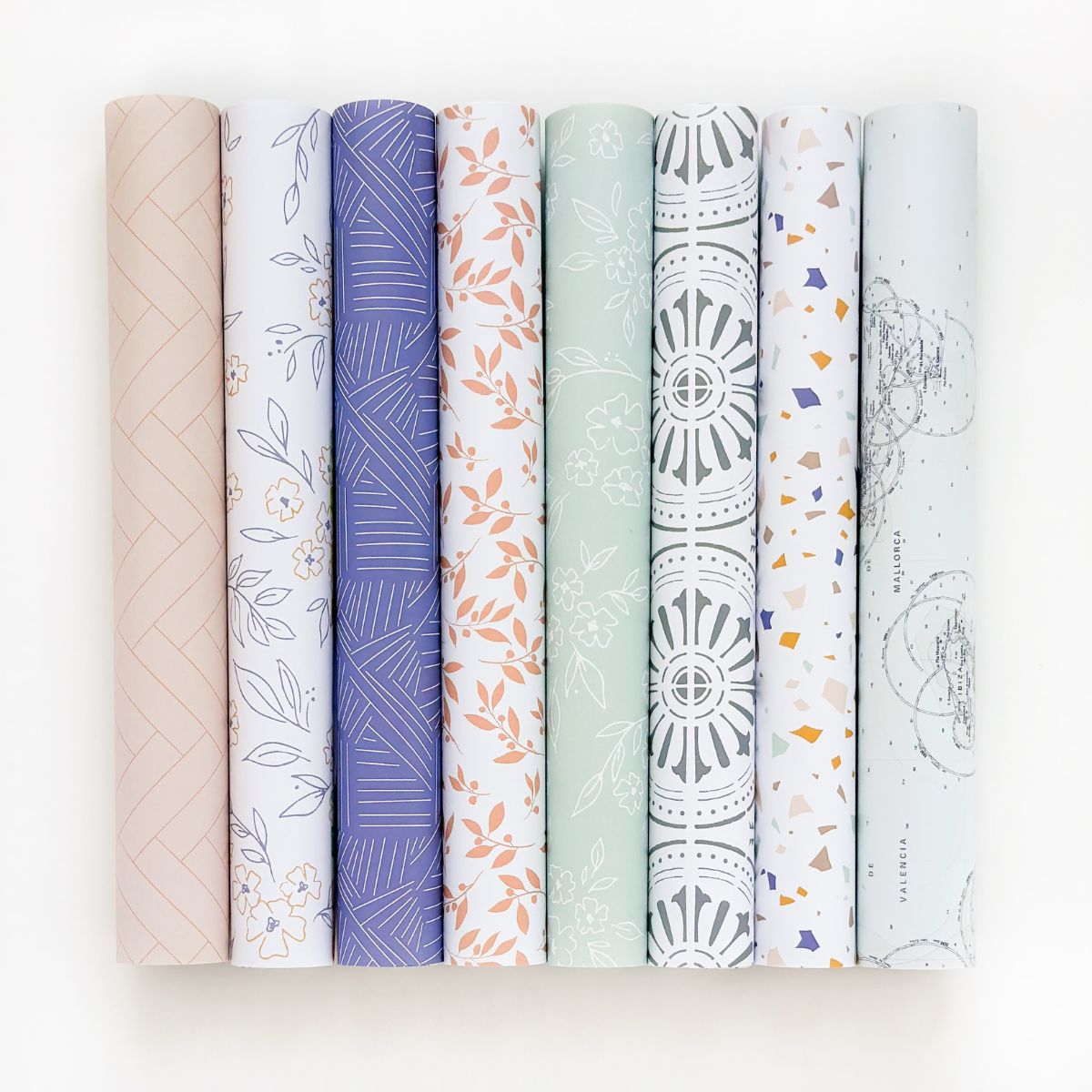 • Sete rolos de papel decorativo com padrões variados e cores suaves