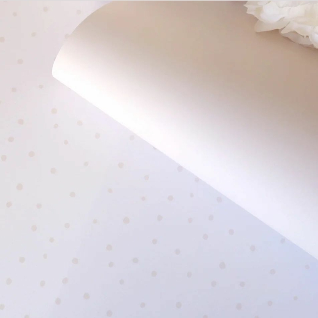 • Folha branca sobre superfície com padrão de pontos creme e flores brancas ao fundo