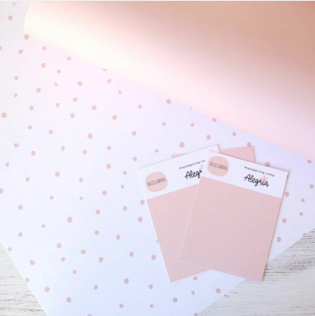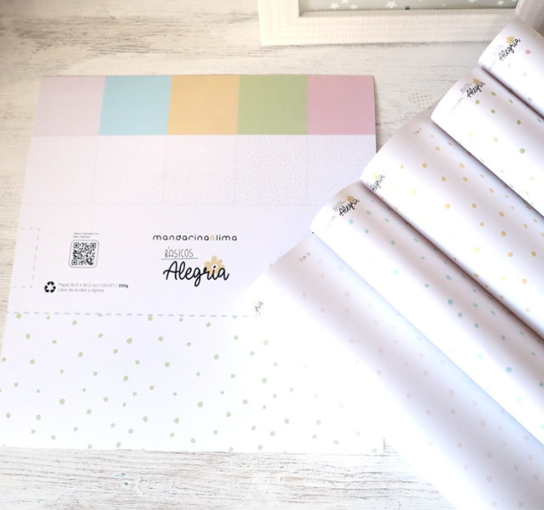 Coleção de 10 papéis impressos em uma face, 5 cores sólidas e 5 com fundo branco e bolinhas na cor ideal para acompanhar a coleção Alegría.