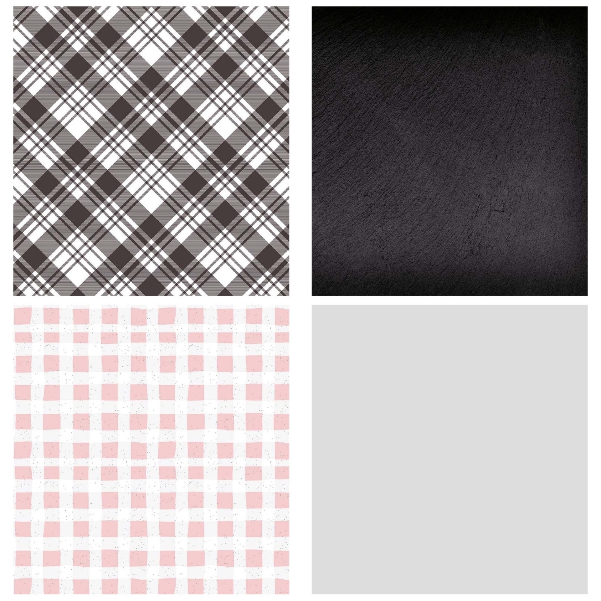 • Quatro padrões diferentes: xadrez preto e branco, textura preta lisa, quadriculado rosa branco e cinza liso