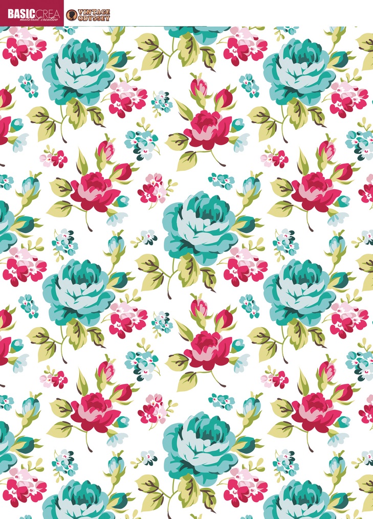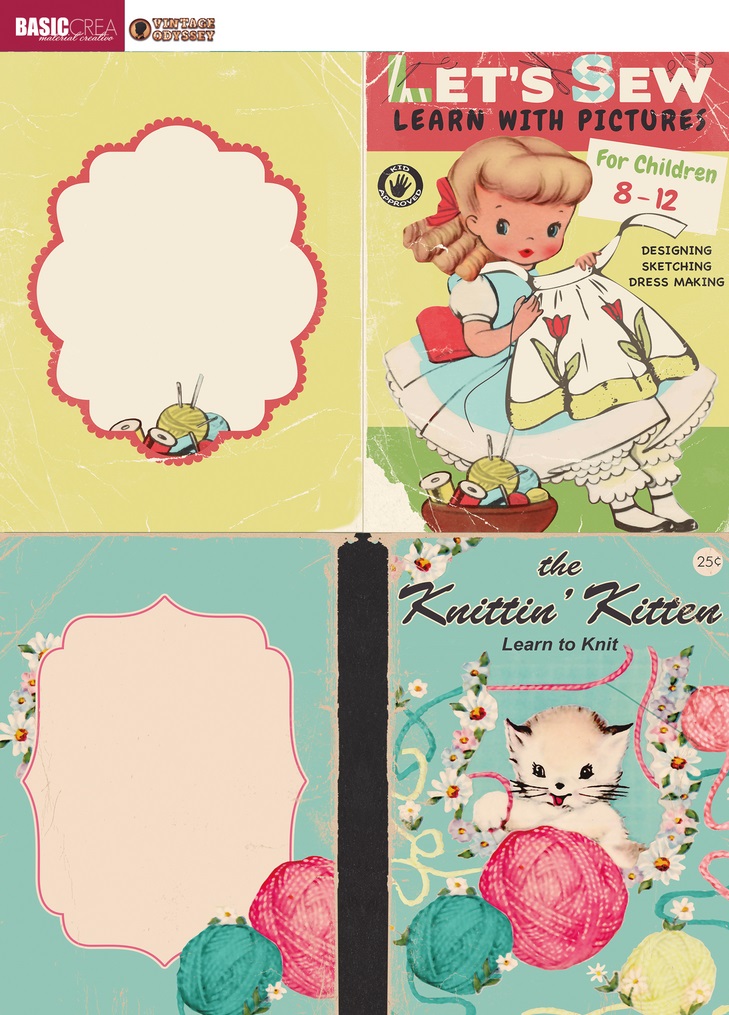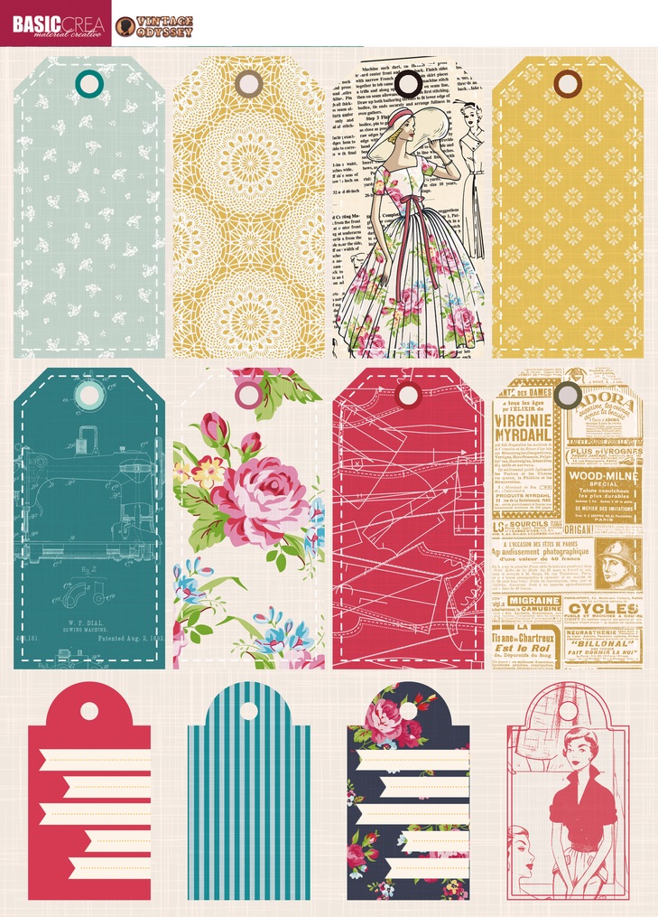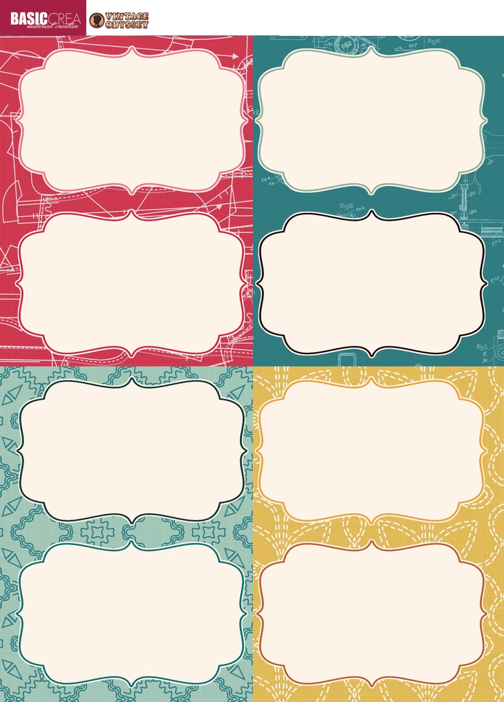 • Seis etiquetas decorativas com bordas onduladas em fundos coloridos com padrões, texto 'BASIC CREA' e 'VINTAGE CUT FILES' no topo.