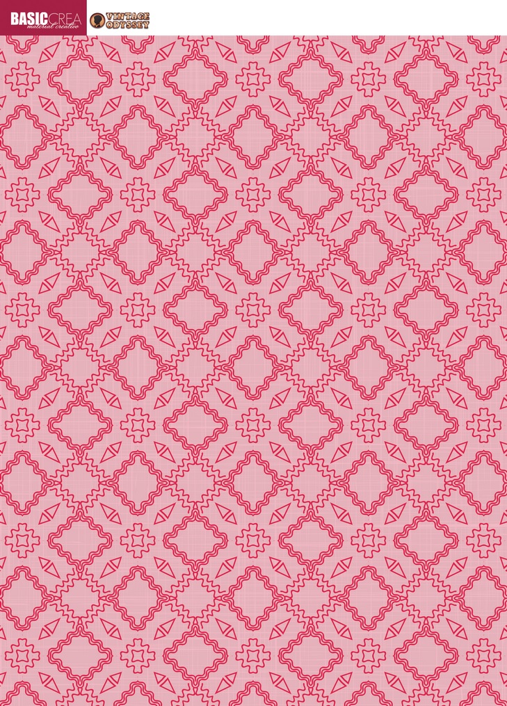 • Papel de parede ou tecido rosa com padrão geométrico repetitivo e logótipos no canto superior esquerdo