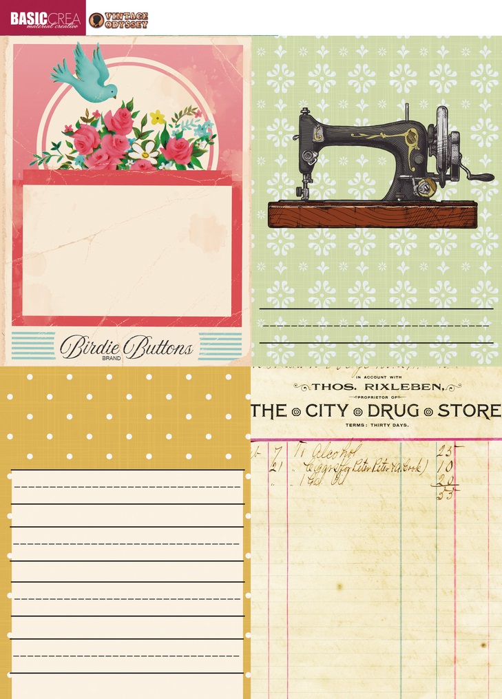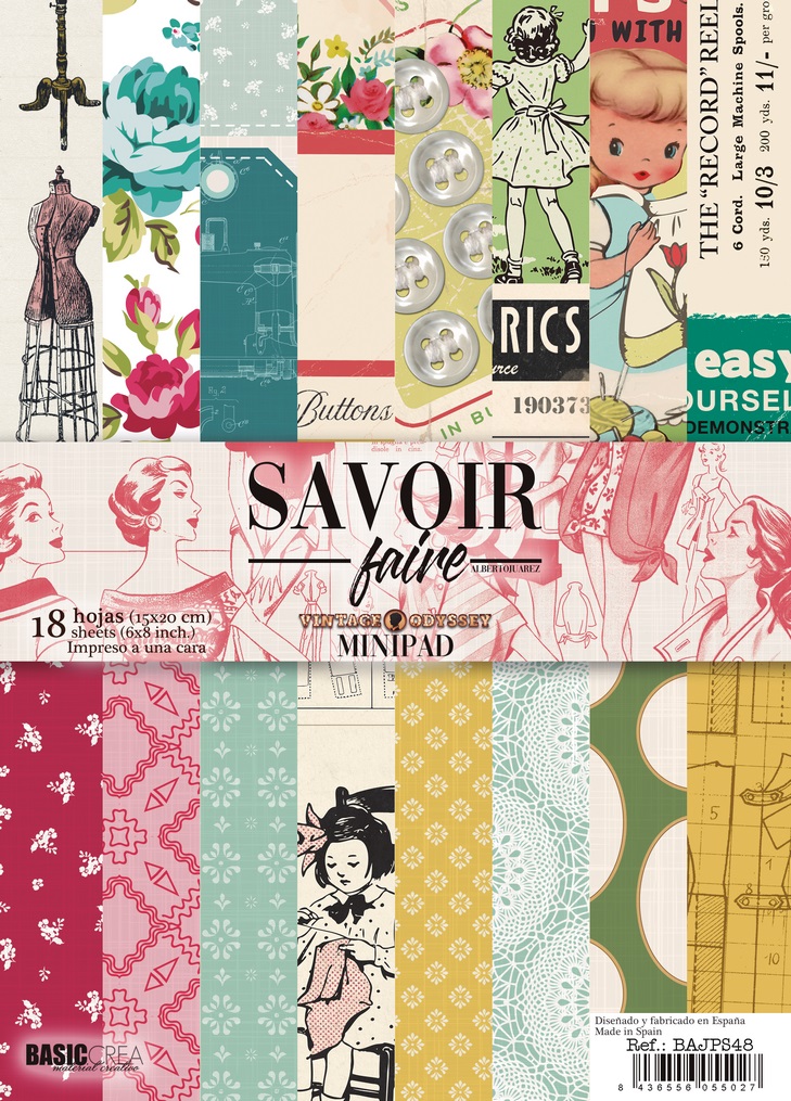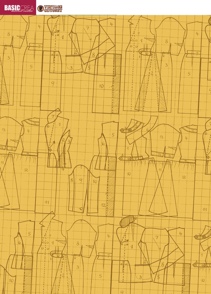 Bloco de 18 papéis de 180g, estampados a uma face, onde papéis com ilustrações de manequins, máquinas de costura, moldes, cartões... e outros elementos relacionados, em estilo vintage.