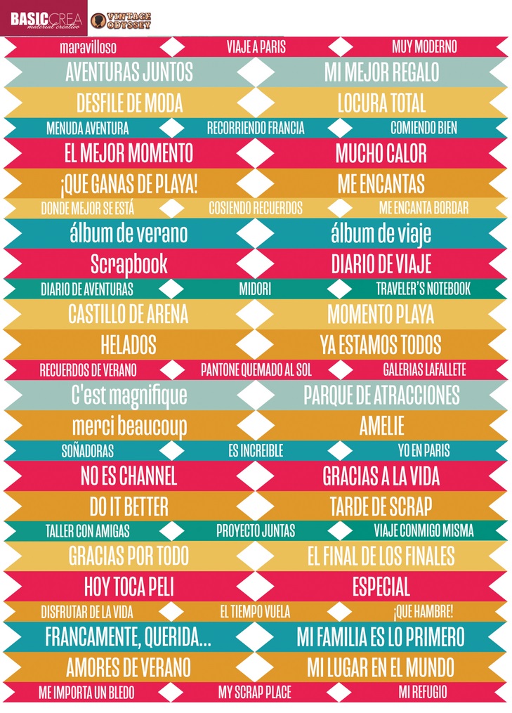 • Etiquetas coloridas para scrapbooking com frases em espanhol e inglês, em várias cores e dispostas em fileiras
