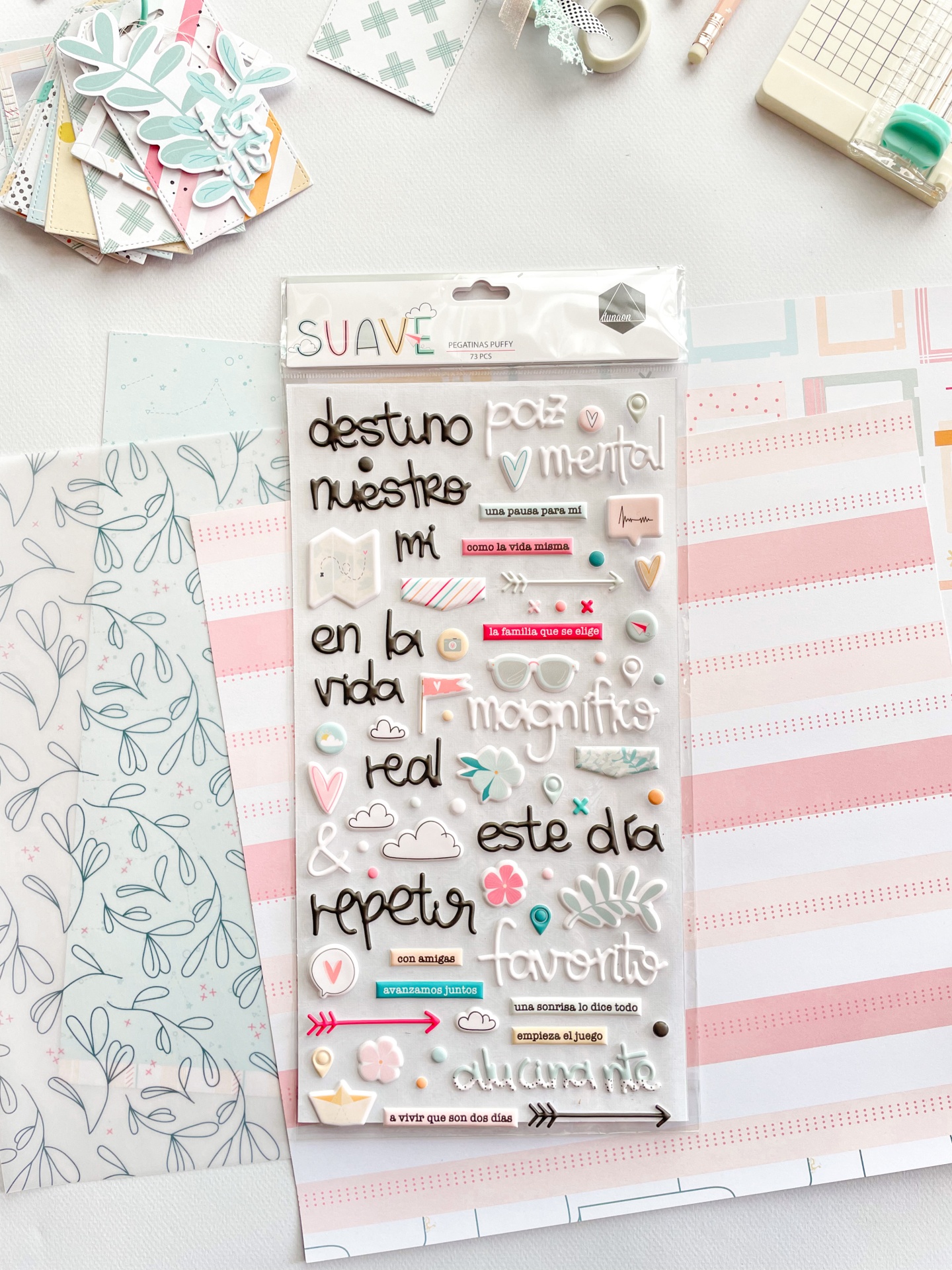 • Pacote de carimbos transparentes com frases em espanhol e elementos decorativos em torno de materiais de scrapbooking