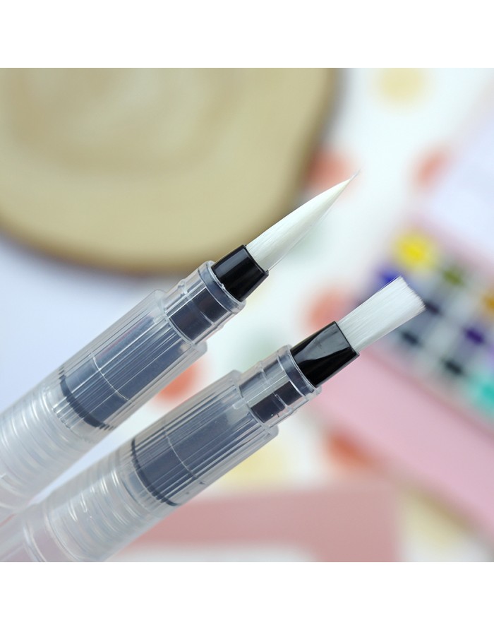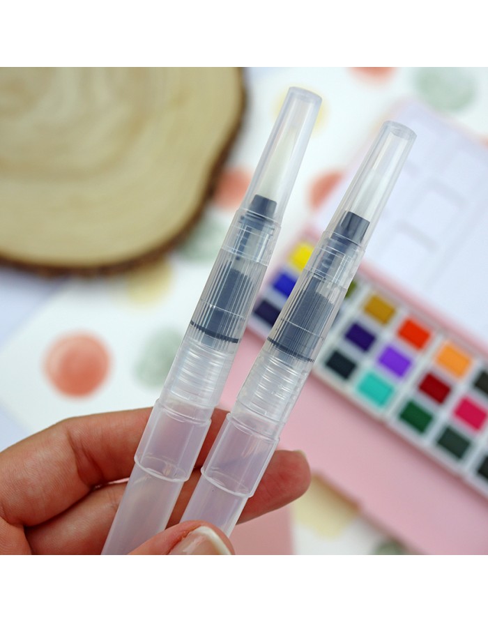 Possui 24 half godets (meias pastilhas) e dois pincéis com tanque de água, um mais fino para detalhes e outro com cerdas mais grossas para fundos.
