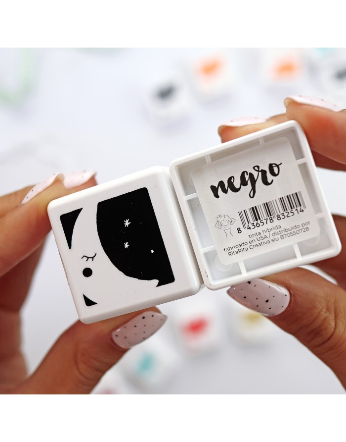 • Mini estojo de tinta preta com tampa ilustrada e rótulo negro