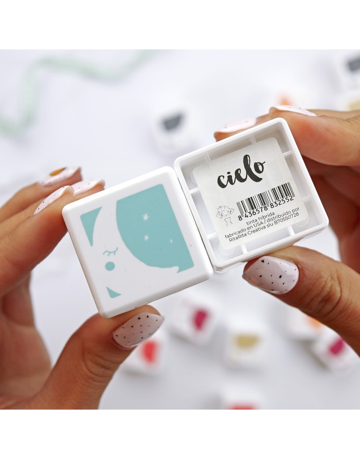 • Caixa pequena branca com ilustração azul de rosto e texto 'cielo' na parte inferior