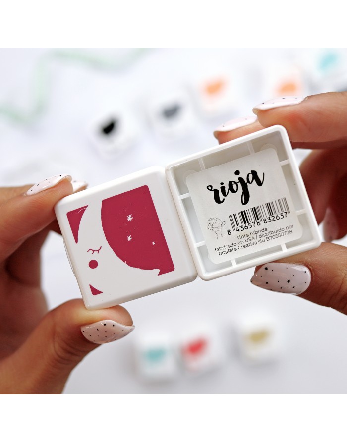 Produto cosmético quadrado branco com desenho vermelho e rótulo 'rioja' segurado por mãos com unhas pintadas