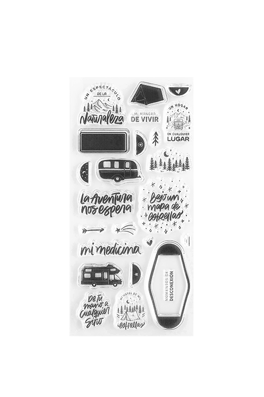 • Carimbos transparentes com frases e desenhos de natureza e aventura