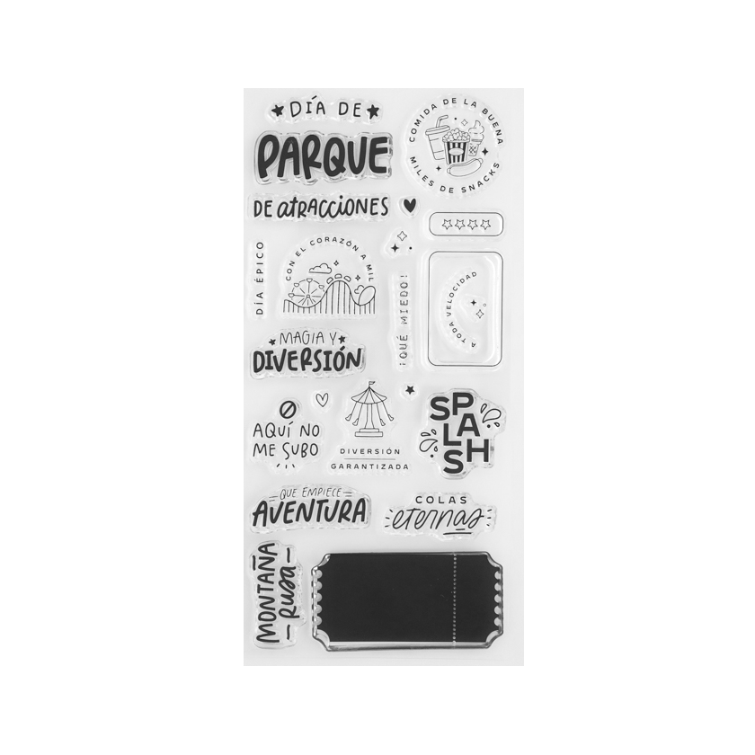 • Conjunto de carimbos com frases e desenhos de parque de diversões em espanhol