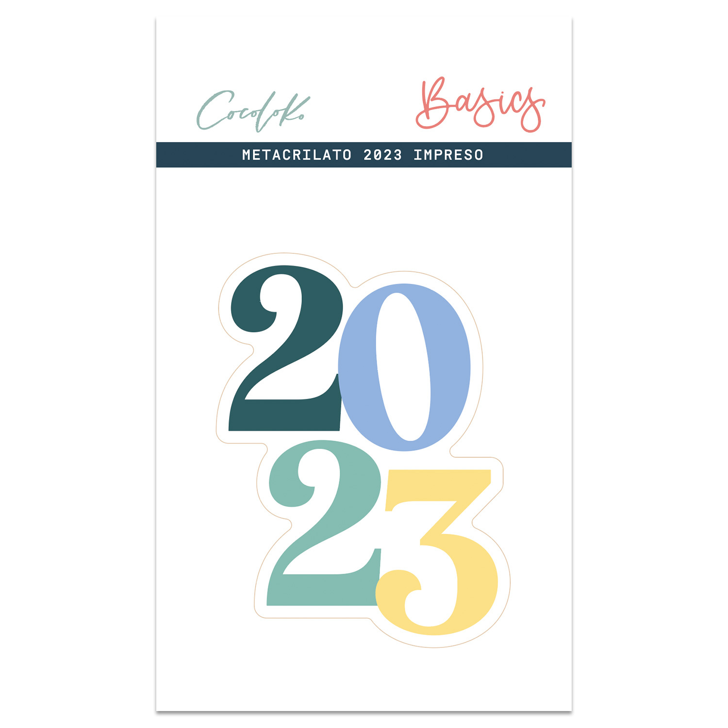 • Produto em metacrilato com números coloridos 2023 embalado em fundo branco