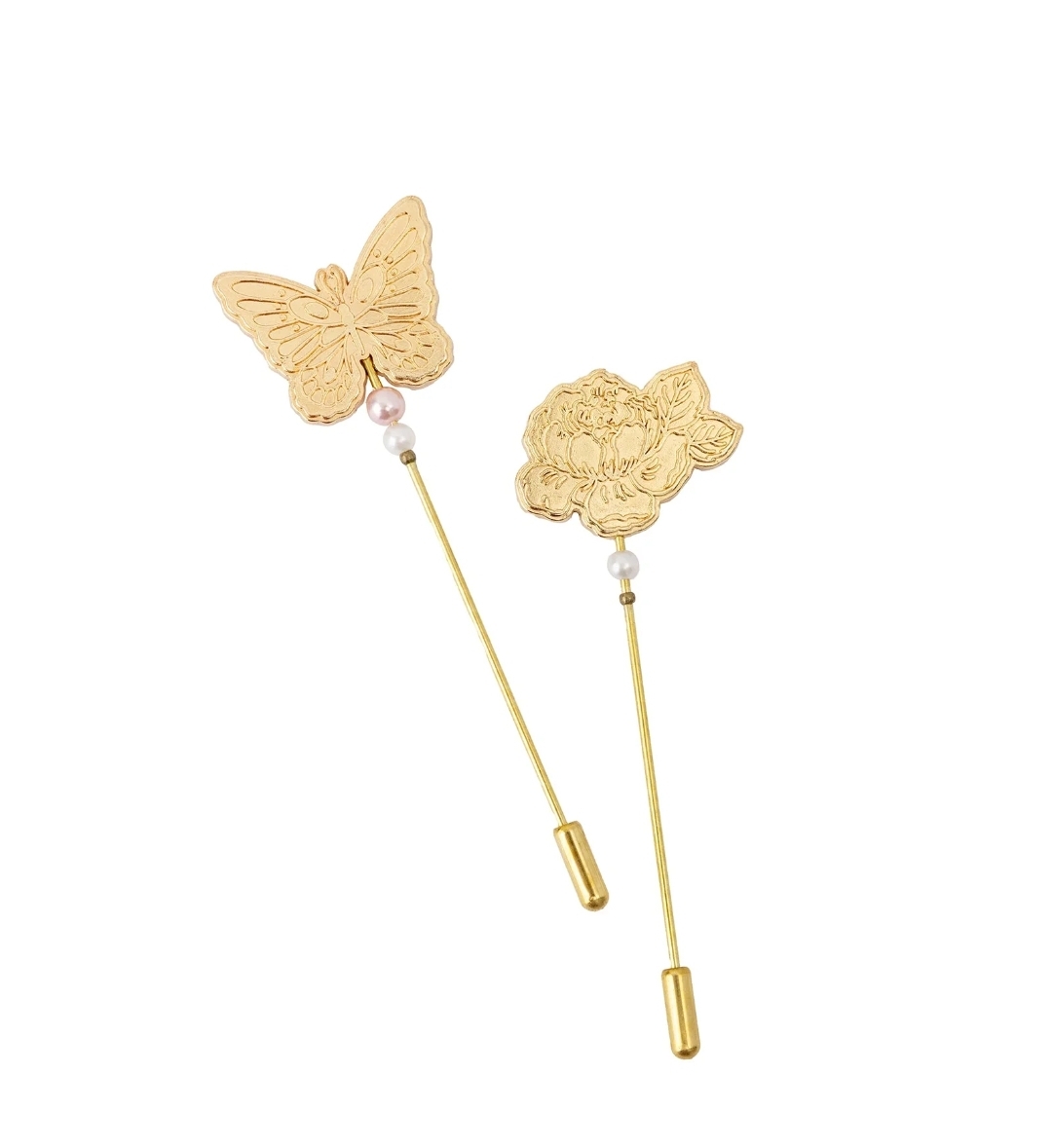 • Alfinetes dourados com borboleta e flor e pérolas