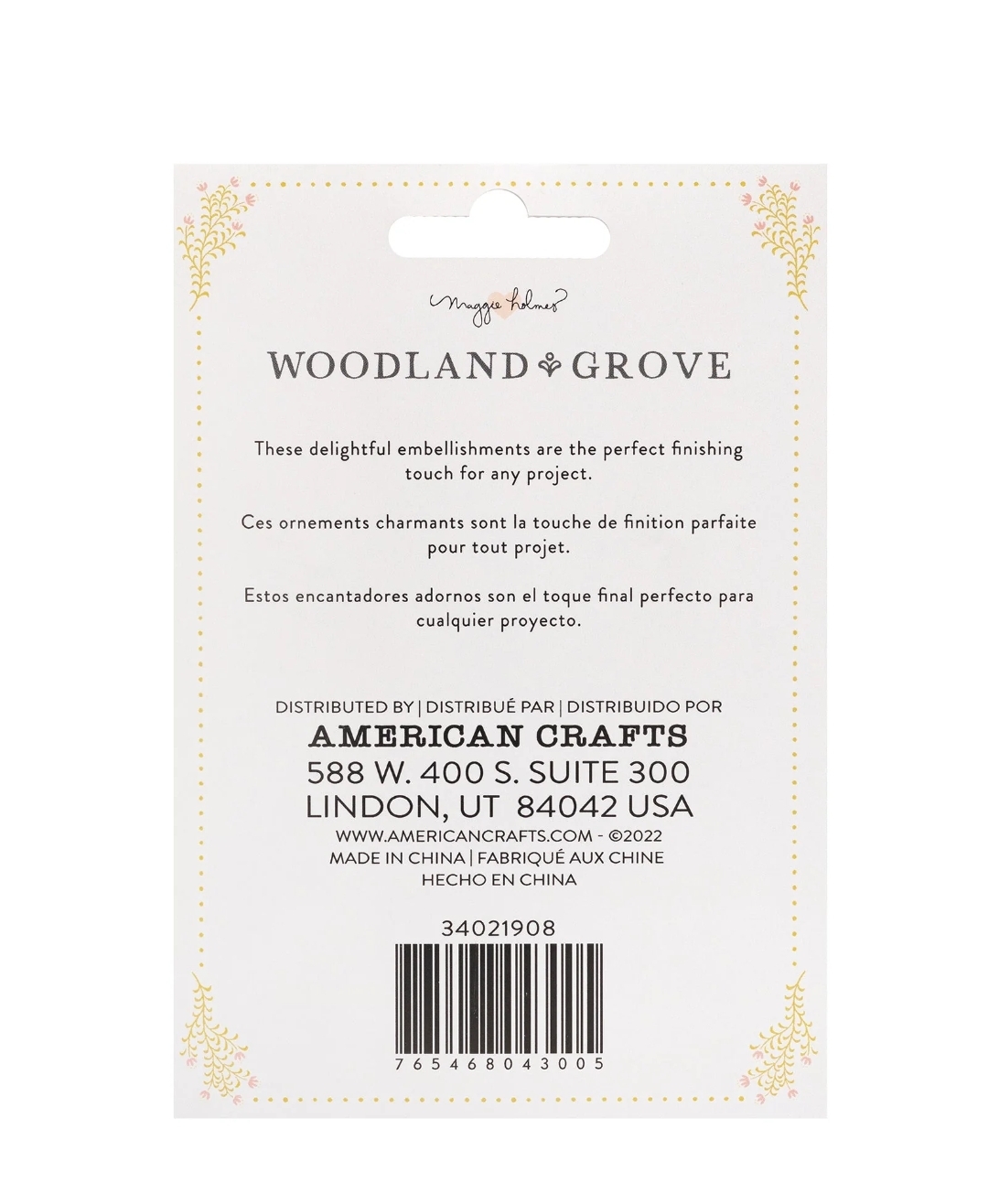• Etiqueta branca com texto e pequeno padrão floral dourado nas bordas