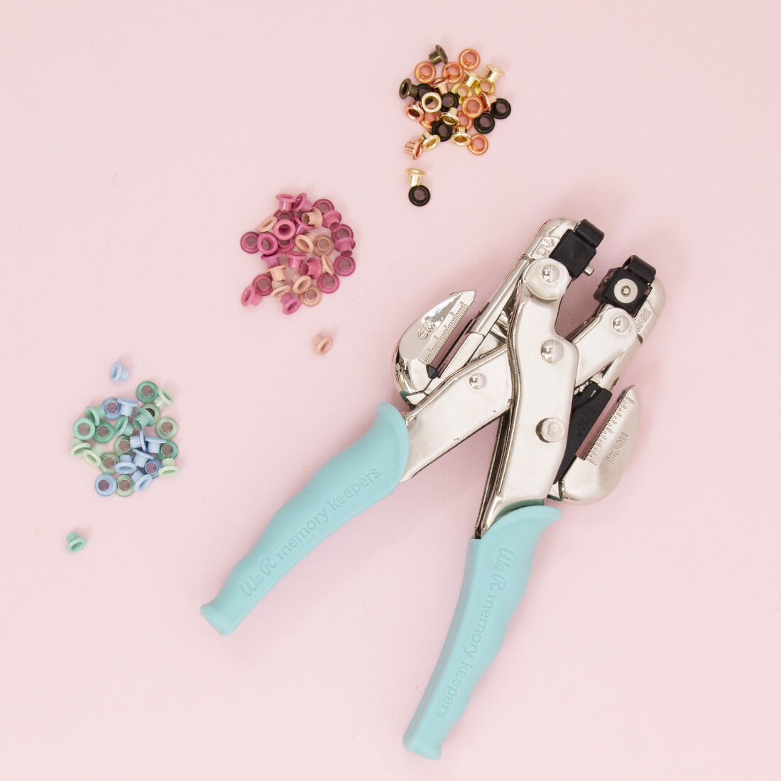 Esta ferramenta permite perfuração fácil e precisa e colocação de ilhós. Faz furos em dois tamanhos: 0,3 ou 0,48 cm. A guia de profundidade permite limitar a distância até a borda do papel em que as perfurações são feitas, até um máximo de 2,5 cm.