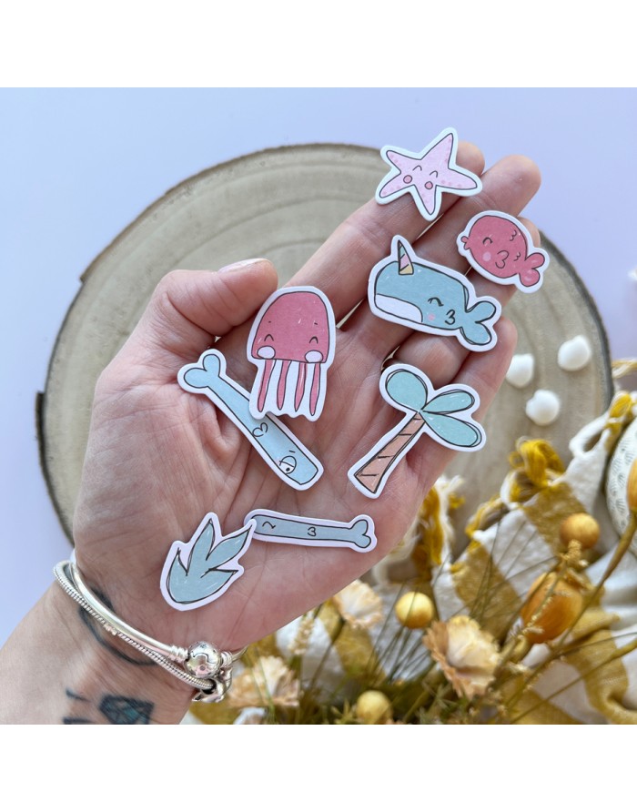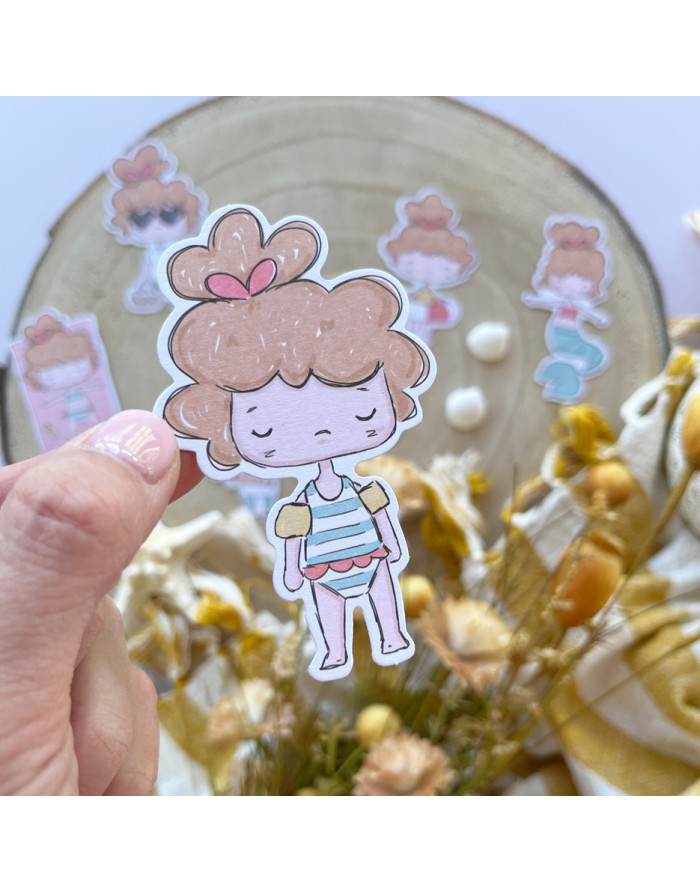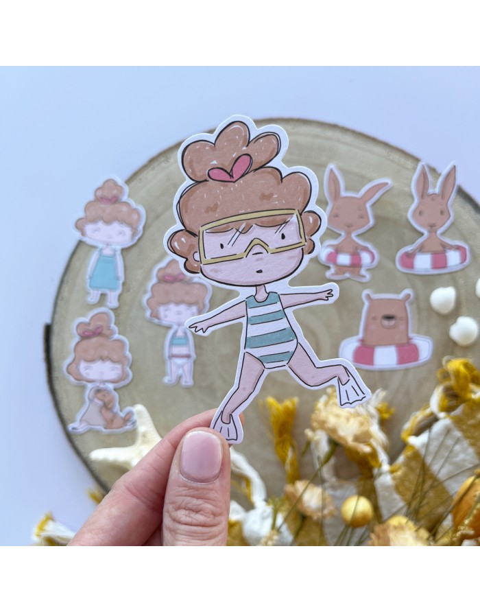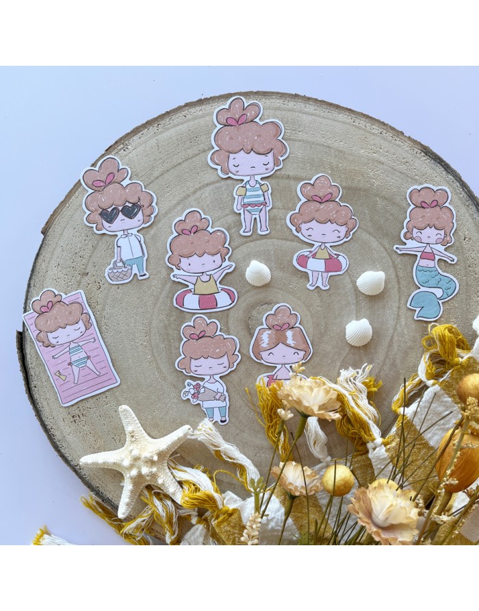 Este conjunto de ilustrações recortadas pertence à coleção de verão Playa o Piscina - Alúa Cid e é composto por 43 peças pré cortadas, de 300 gr,  impressas com as personagens da coleção.
