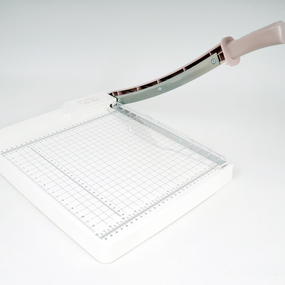 • Guilhotina de papel branca com lâmina cor de rosa e base com grelha de medidas
