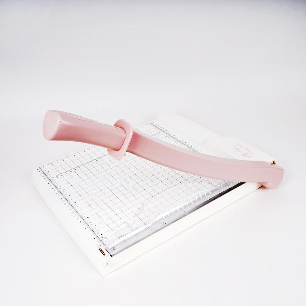 • Guilhotina de papel branca e rosa com régua e alça texturizada