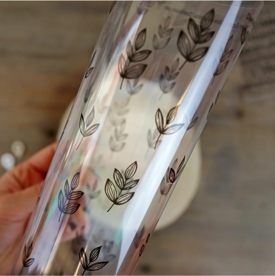 • Copo de vidro transparente com padrão de folhas pretas