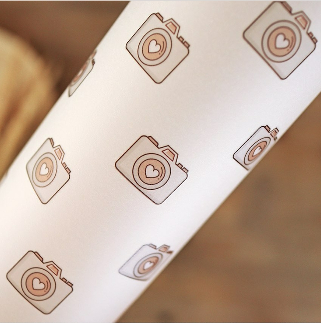 • Rolo de papel branco com câmeras desenhadas em dourado e bege