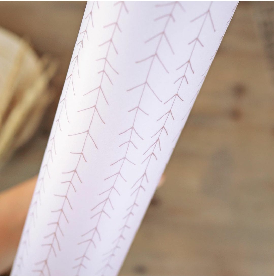 • Rolo de papel branco com padrão de linhas finas rosa formando galhos.
