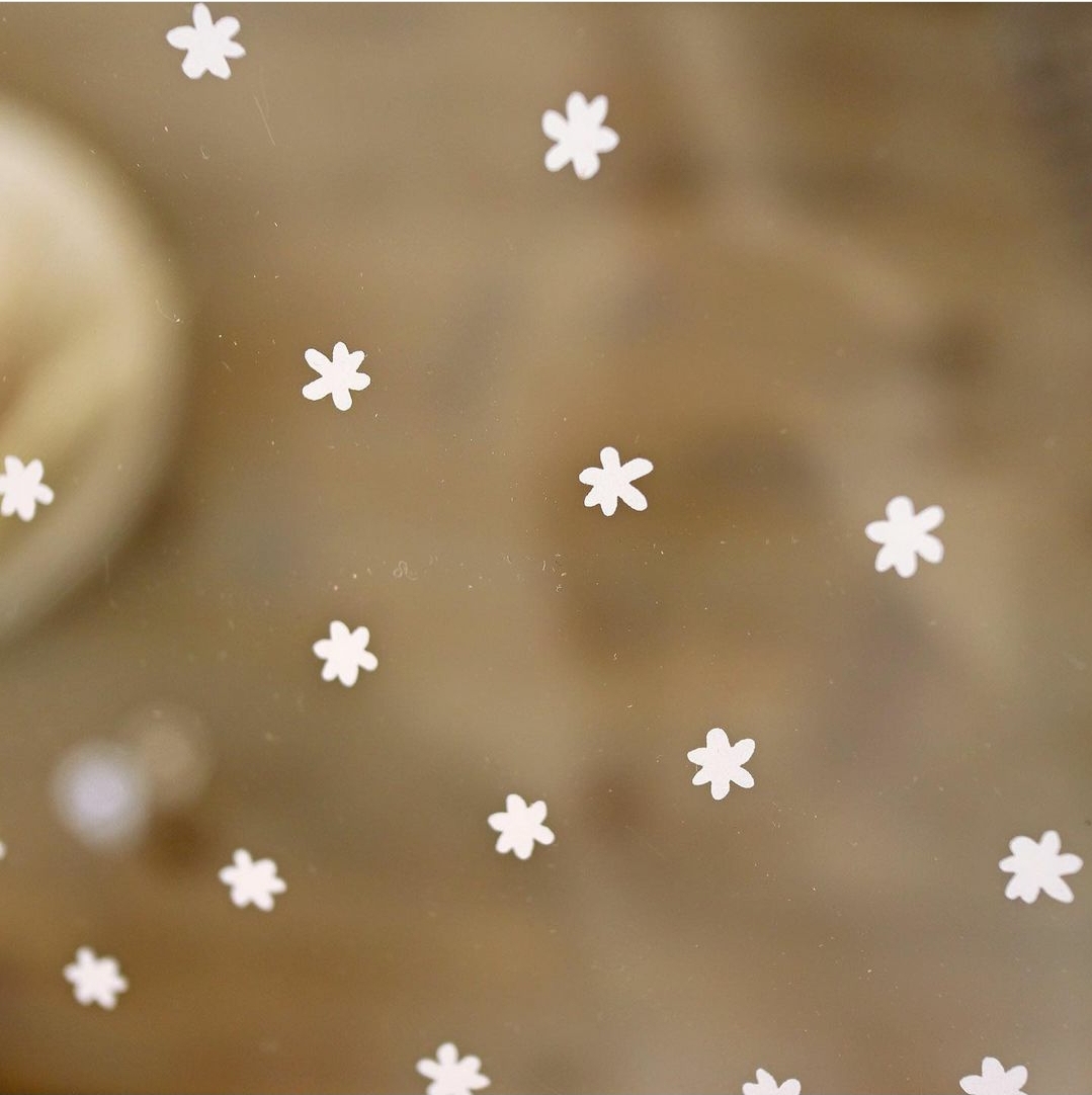 • Adesivos florais brancos em vidro com fundo castanho desfocado