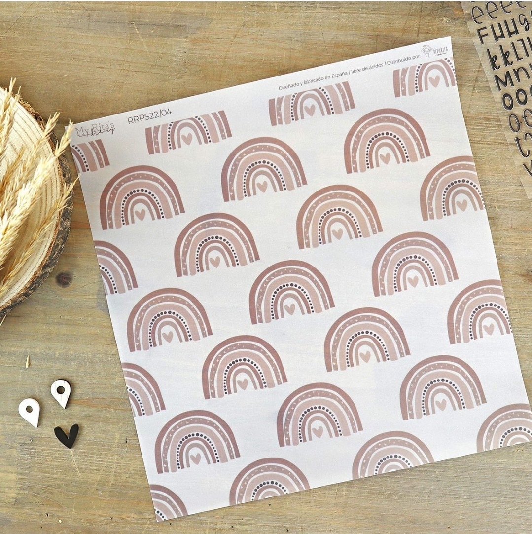 Papel decorativo com padrões de arcos-íris e folhas em tons neutros, embalagem com texto My Rita's industry num tampo de madeira