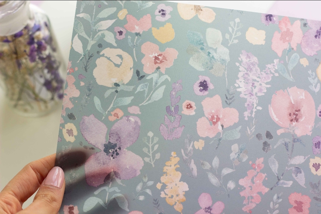 - 1 folha de papel vegetal com o estampado protagonista da coleção.