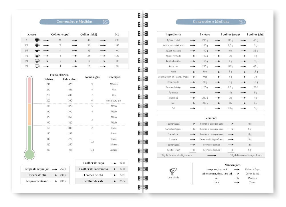 • Livro aberto mostrando tabelas de colheres e medidas culinárias em português