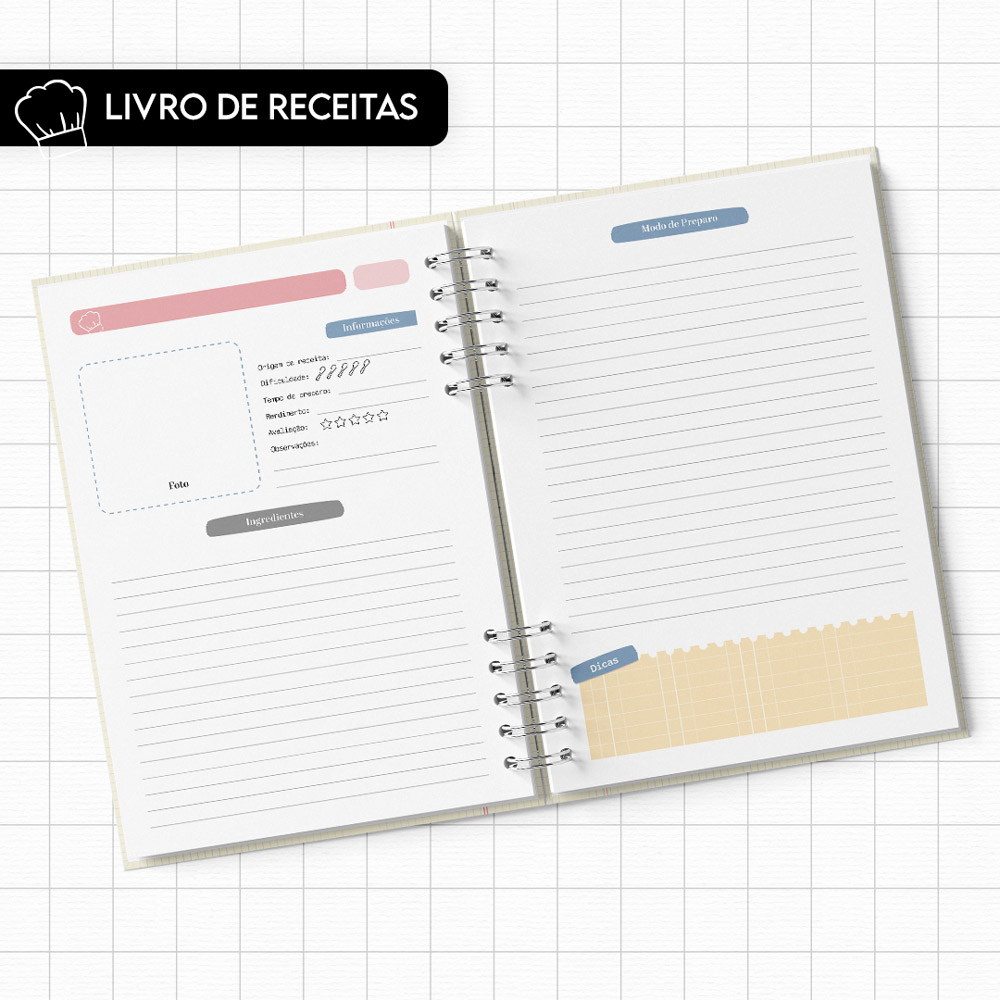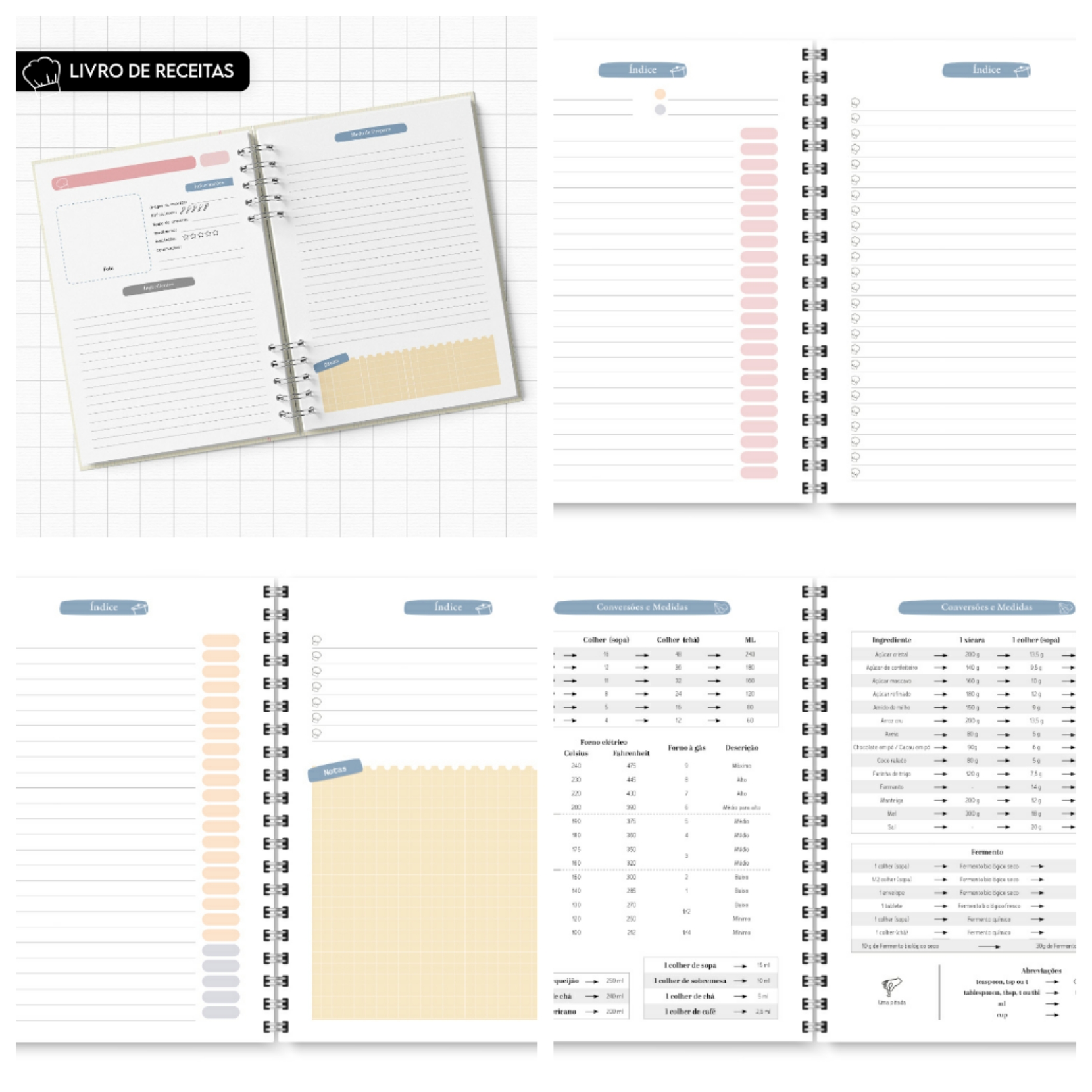 • Livro de receitas em espiral com páginas de anotações e tabelas