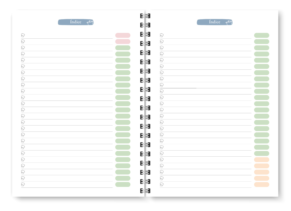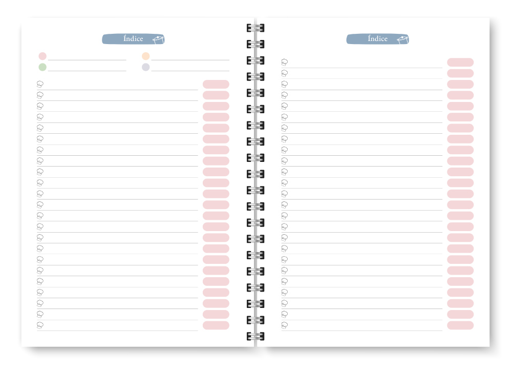 • Caderno aberto com páginas brancas, linhas cinzentas, caixas de seleção rosa e cabeçalhos azuis com texto índice