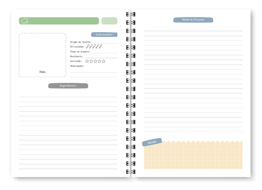 • Livro de receitas aberto com páginas pautadas e espaços para ingredientes e preparação