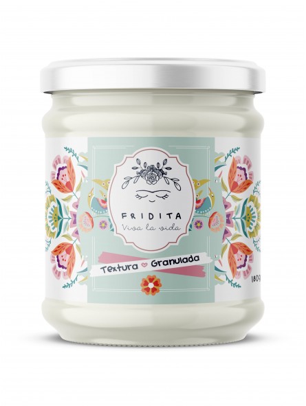 • Frasco de vidro com rótulo floral e texto FRIDITA, Textura Granulada