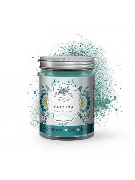 • Frasco de pigmento azul com rótulo floral e tampa metálica