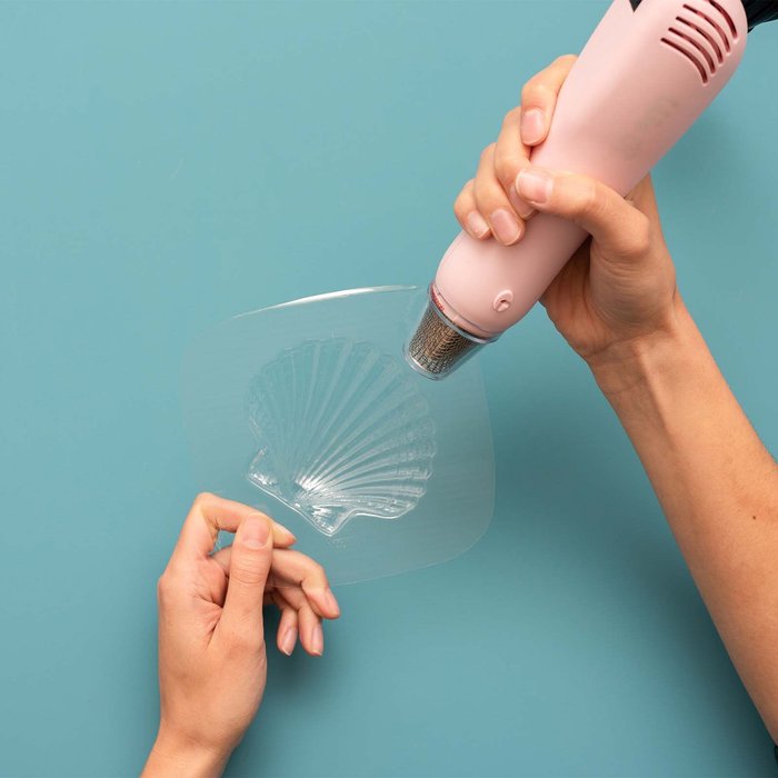 • Mãos a moldar acrílico transparente com pistola de calor rosa sobre fundo azul