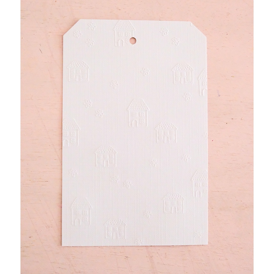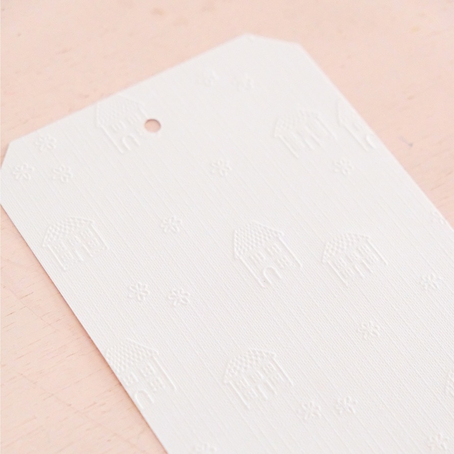 • Etiqueta branca com relevo de casinhas e flores em fundo claro