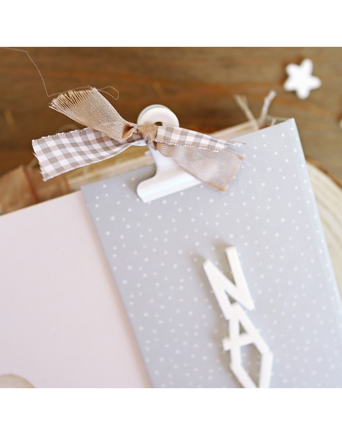 • Clipe branco com laço de tecido xadrez bege e branco e fundo cinza com bolinhas brancas.