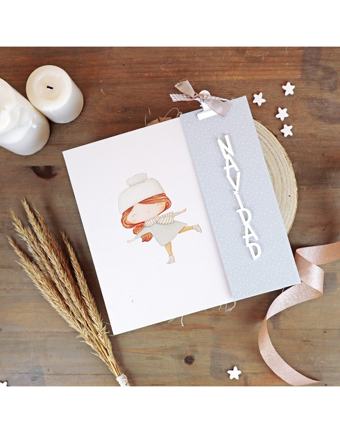 Cartão de felicitações com etiqueta cinzenta e texto 'NAVIDAD' e desenho de menina patinando