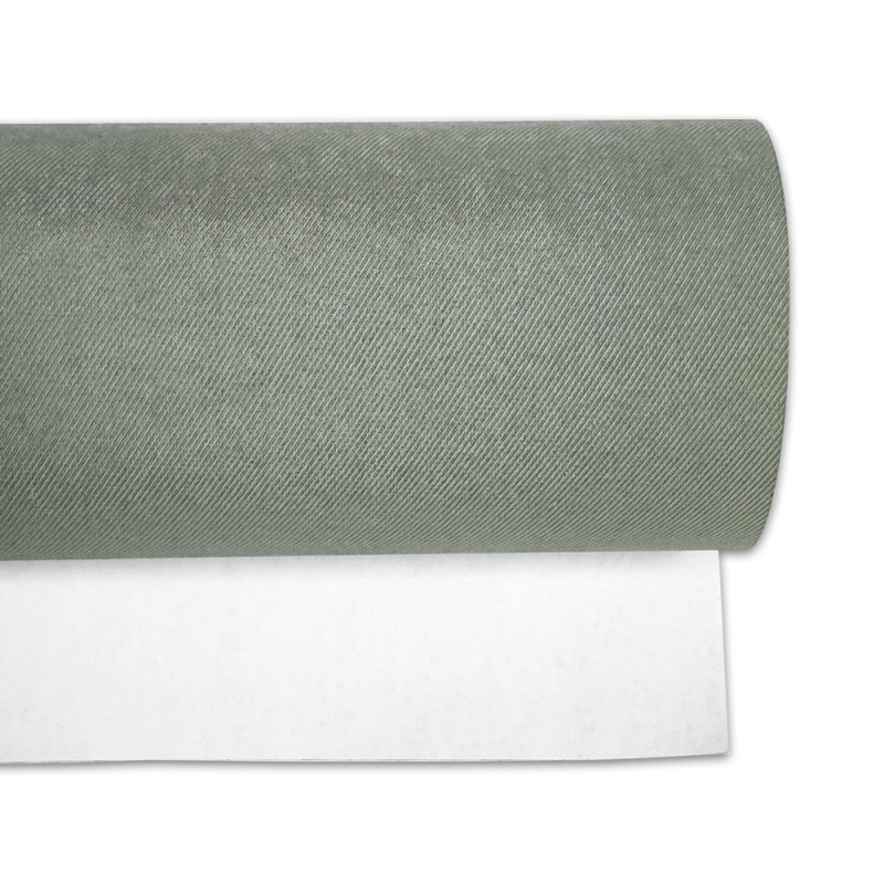 • Rolo de tecido cinzento com padrão diagonal sobre superfície branca