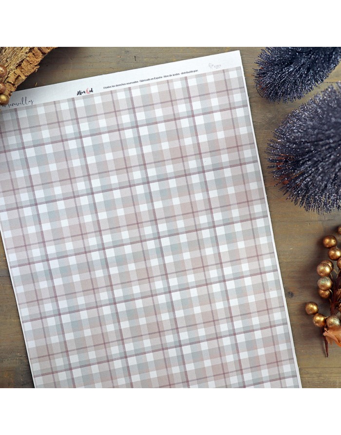 • Folha de papel decorativo xadrez em tons suaves sobre mesa de madeira com decoração azul e dourada.